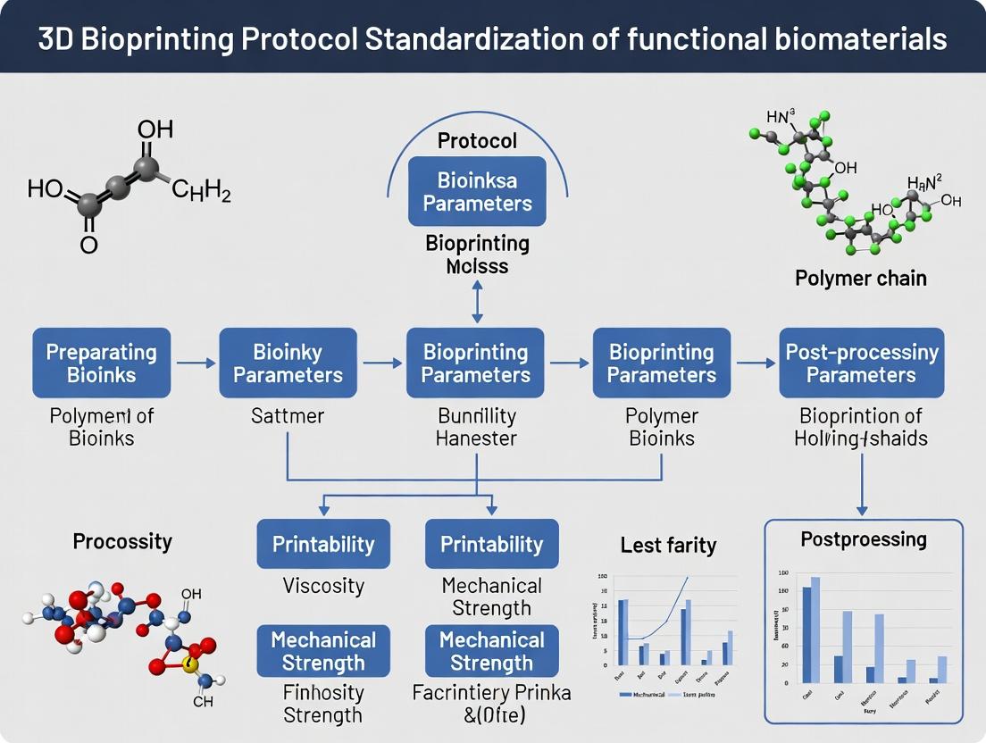 The standardization of 3D bioprinting protocols is critical for advancing functional biomaterials research and ensuring reproducibility in tissue engineering and drug development. This document delineates the interdependent relationship between biomaterial properties, bioink formulation, and printability, establishing a foundational framework for experimental design.