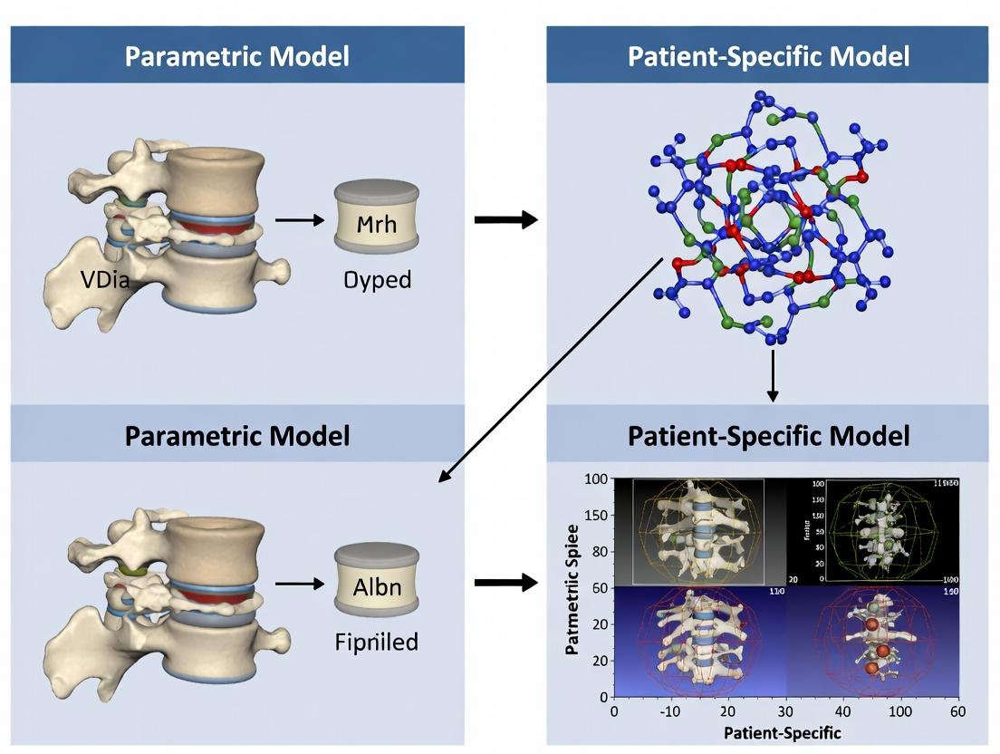 Parametric Spine Models are generalized, template-based models whose geometry and material properties are defined by a set of adjustable input parameters (e.g., vertebral body dimensions, disc height, lordosis angle, bone density). These parameters can be varied across a population to generate a spectrum of model instances representing average or statistical anatomies.