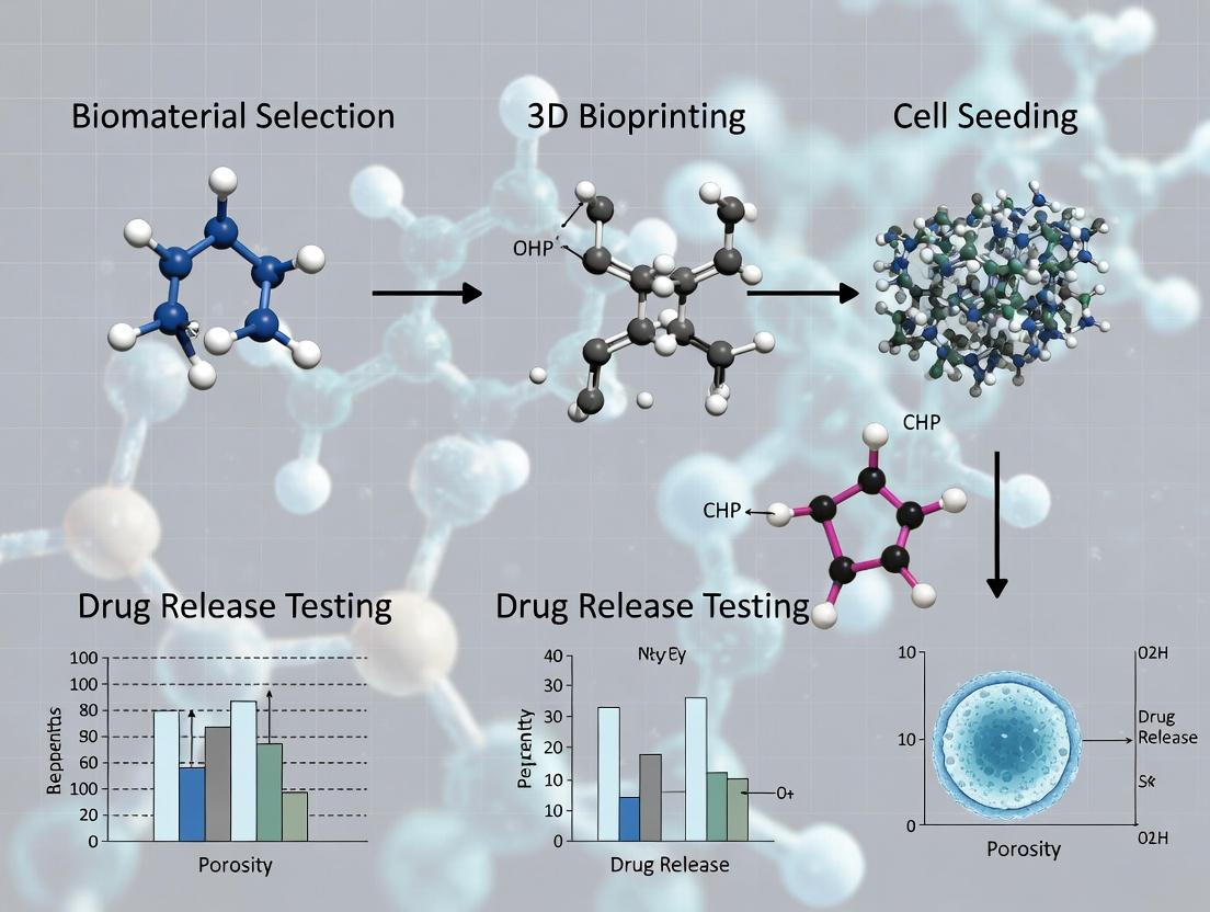 A 3D bioprinted biomaterial scaffold for drug delivery is an integrative construct where the scaffold architecture, material chemistry, and biological cargo are computationally designed and layer-by-layer deposited. The primary goal is to achieve spatiotemporal control over drug pharmacokinetics at a target site, enhancing therapeutic efficacy and reducing systemic side effects. Key objectives include: (1) Mimicking native tissue mechanics, (2) Enabling high-dose local delivery, (3) Providing tunable, multi-phasic release kinetics, and (4) Supporting host tissue remodeling.